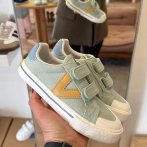 Zapatillas deportivas de la marca Victoria, modelo Tribu de color verde Melón con detalles amarillos y azules. Se ajustan perfectamente a los pies gracias a