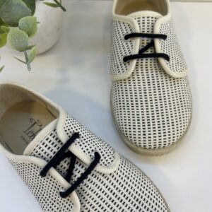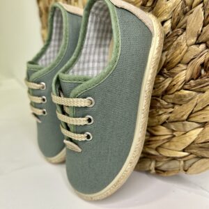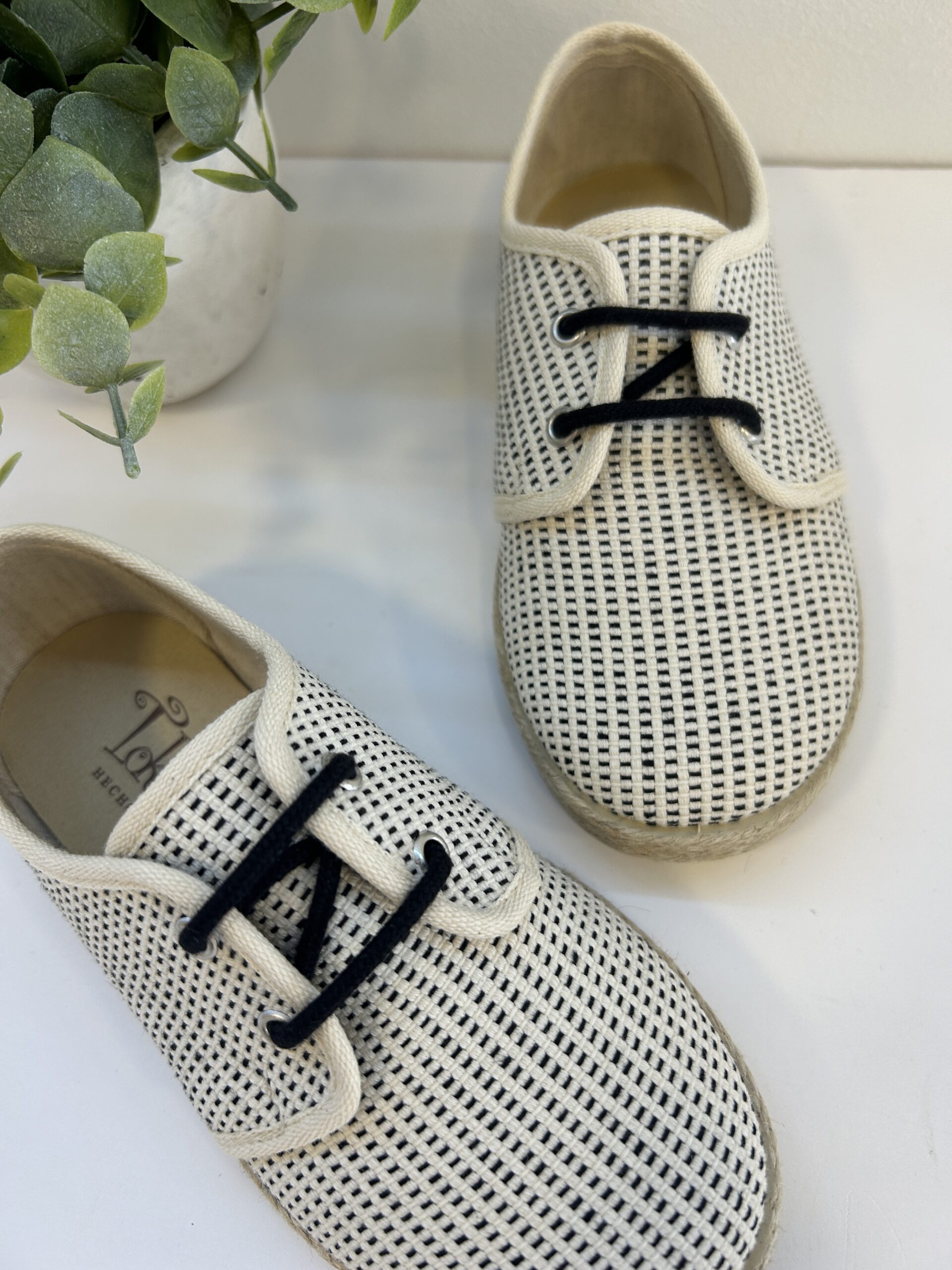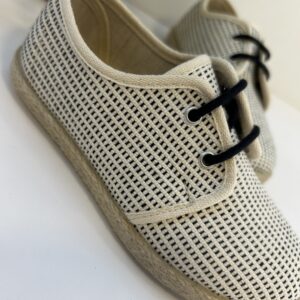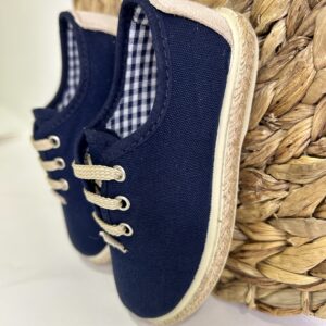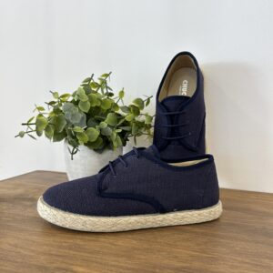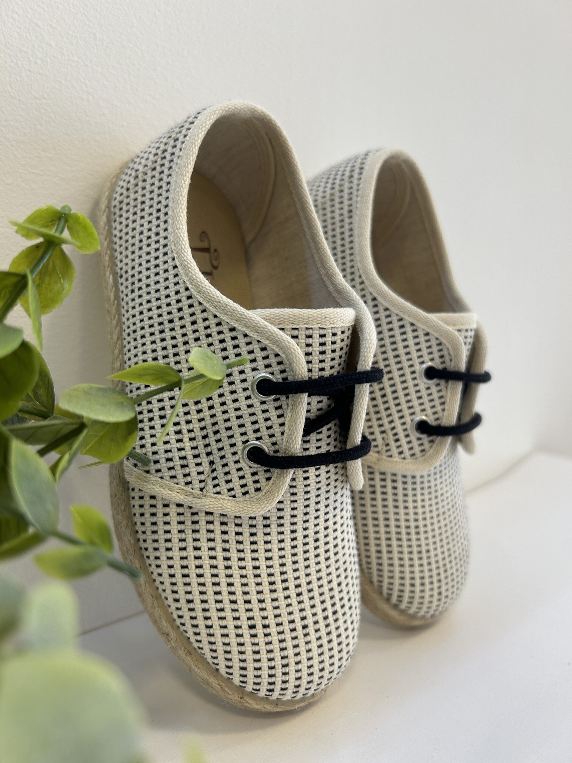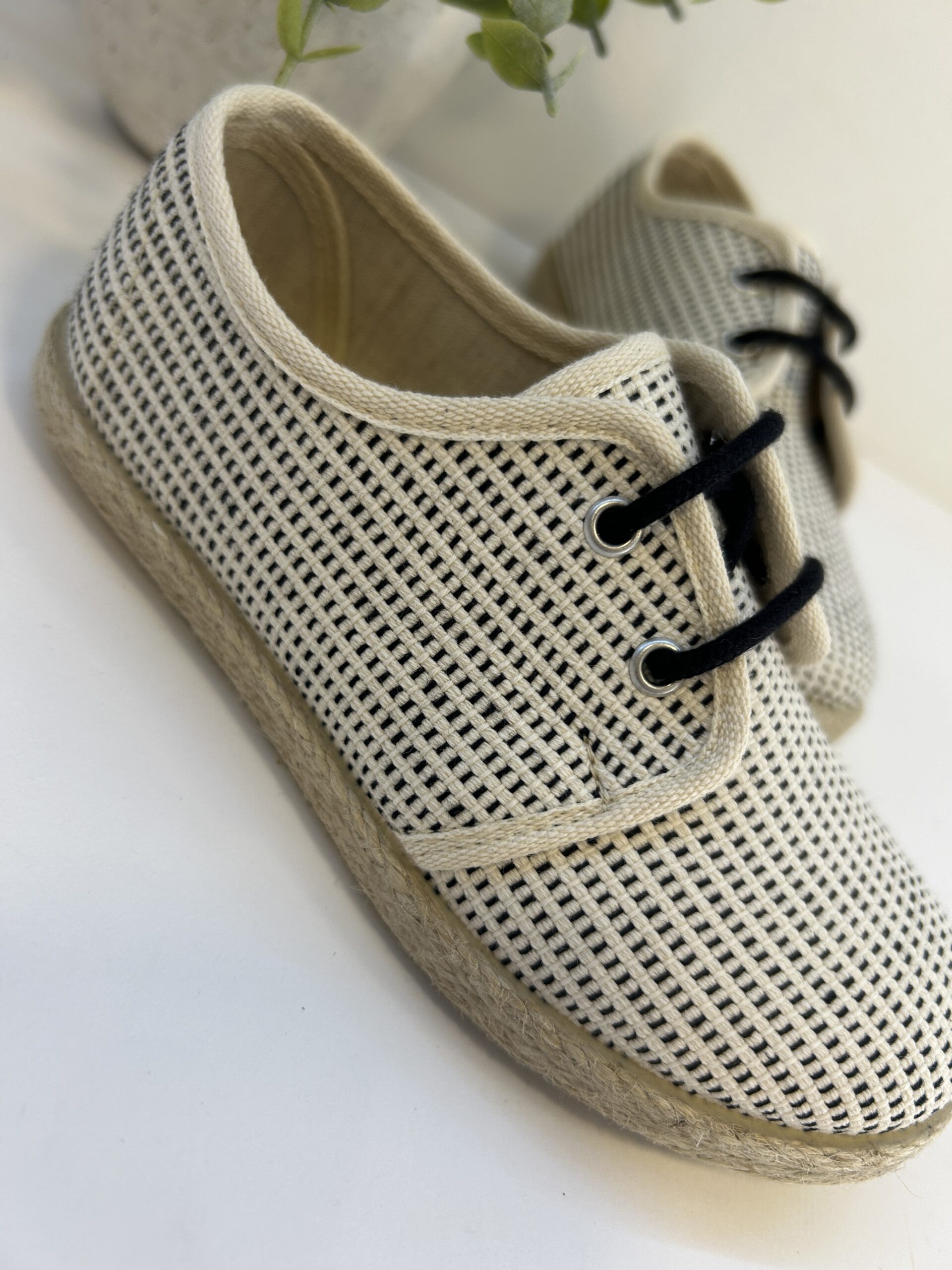 Te presentamos uno de los modelos más exitoso de nuestra colección de primavera verano. Blucher de lino en beige y negro para niñ@s, con un diseño clásico tipo blucher con cordones en color en negro, pero con una estilosa banda de yute alrededor de la suela a imitación de una ligera alpargata.