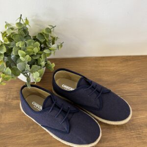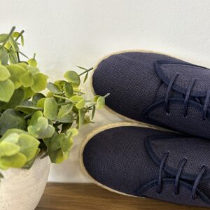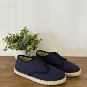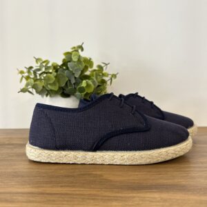 Zapatos bluchers de color azul marino con cordones para niño ideales para primavera verano. Un precioso blucher de lino ajustables y fresquitos para mayor comodidad, y con suela de yute muy veraniegas. Su suela tipo alpargata ¡Nos encantan!