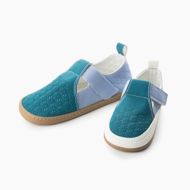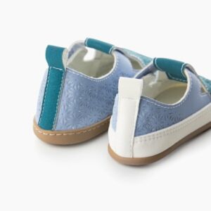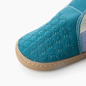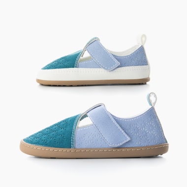 Color turquesa en pala con decorado a troquel, y color lavanda en talón con decorado a troquel. Suela color toffee. .