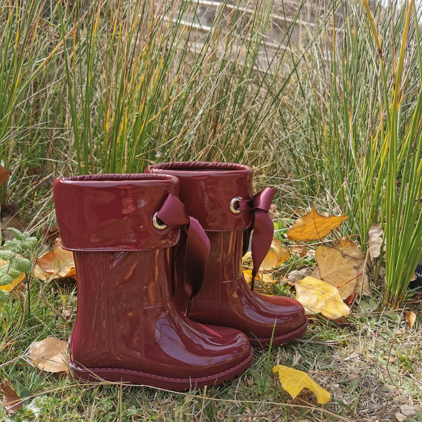 Botas preciosas de agua con detalle de lazo de raso en el cuello que te deja ajustar la botita al tamaño de la pierna de tu hija, con efecto en charol, media caña, cuello vuelto, logo en el talón, realizada en 100% PVC de gran calidad, muy ligera, flexible, plantilla confort extraíble y forro textil para que sus pies transpiren perfectamente y no pasen frío. Una botita muy elegante y clásica para vestir. Es un diseño para nuestras niñas mas coquetas vayan guapísimas y elegantes a la vez.