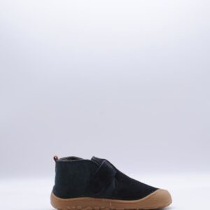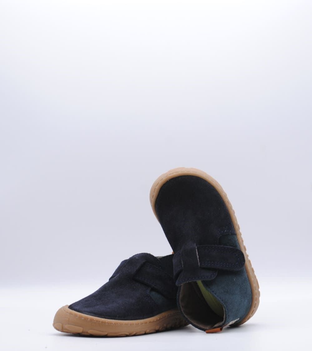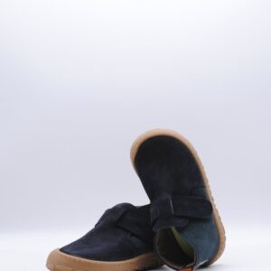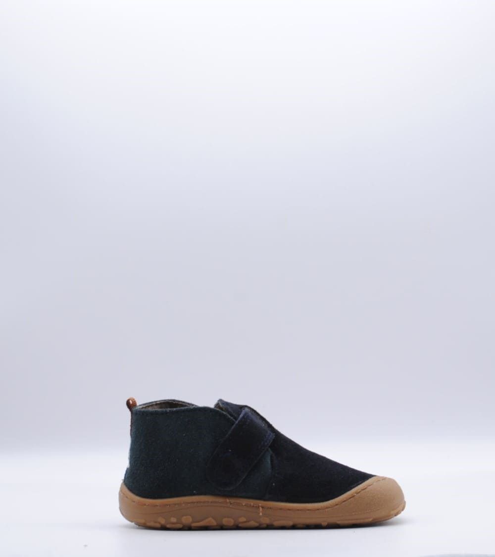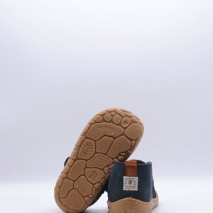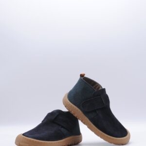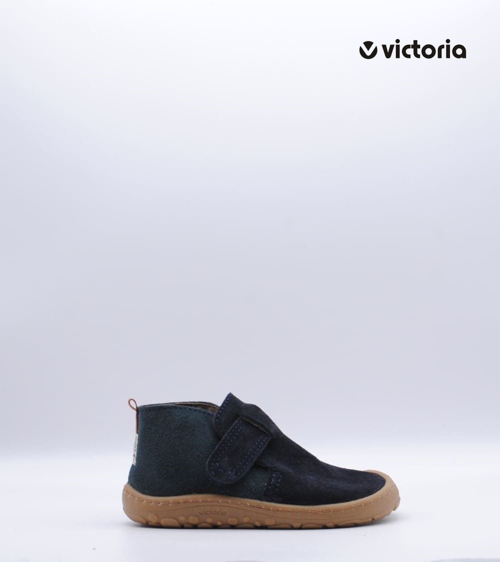 Botín de la marca Victoria, parte de su colección Barefoot, fabricado en piel serraje color marino, con cierre de velcro, suela flexible por metatarsianos, 0 drop y horma ancha.