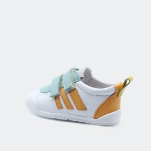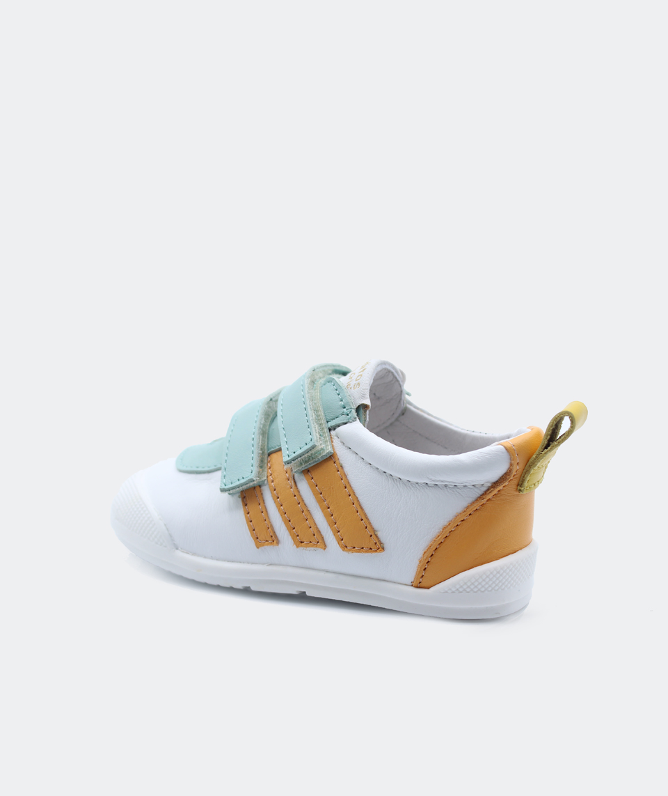 Están compuestas por sistema de cierre de doble velcro y suela de goma antideslizante en color blanco. Plantilla en piel extraíble.