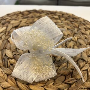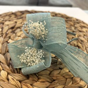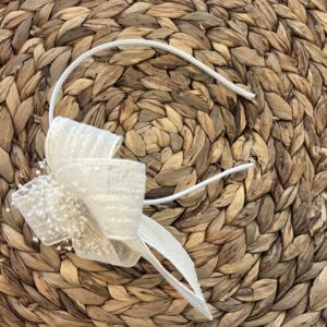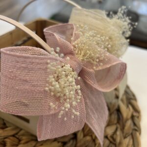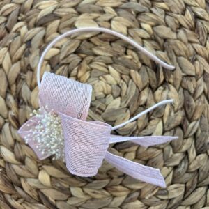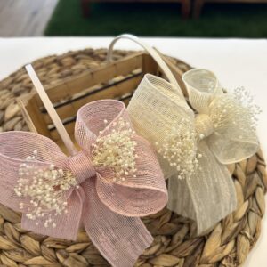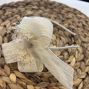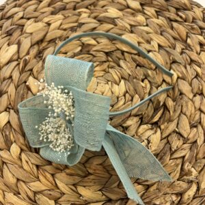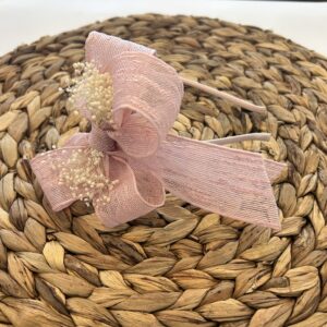 Diadema de niña en tela de yute natural, con el detalle de la lazada grande con flor seca que cuyo lazo mide 13 x 9,5 cm aprox. con vagas de 11 cm aprox. sobre diadema. Muy cómoda, no aprieta. Están hechas a mano con mucho cuidado y cariño. Están disponibles en 4 colores.