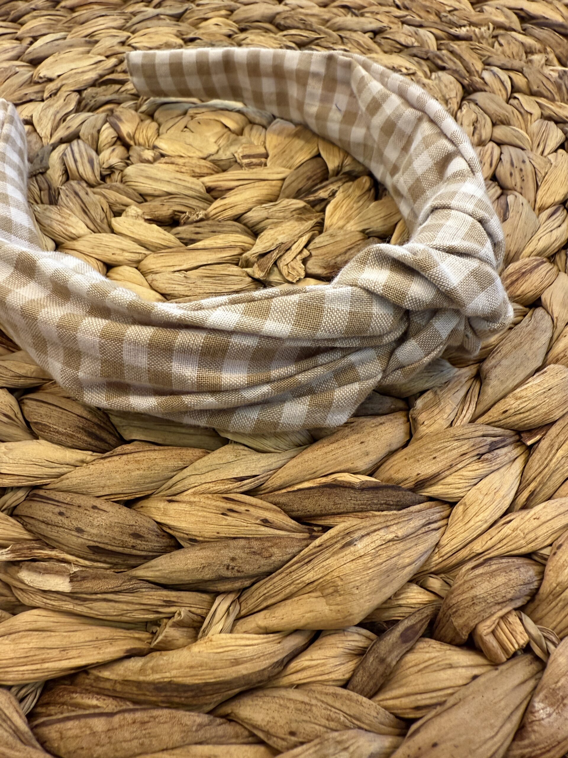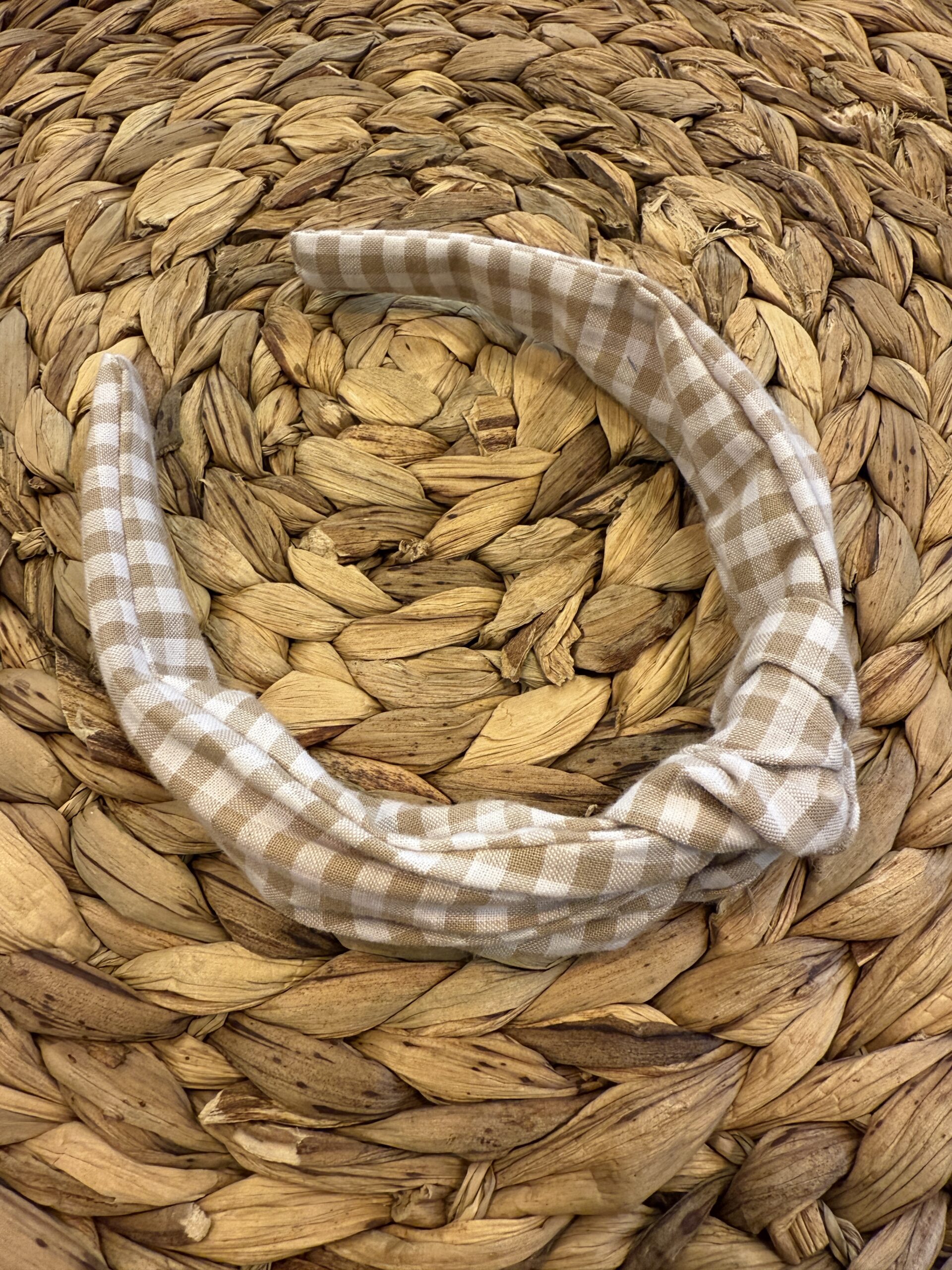 Diadema de niña en tela, suave, en cuadro vichy pequeño en color beige, con el detalle del nudo en el centro , super favorecedora, muy cómoda, no aprieta. Un estampado muy de moda y sirve tanto para invierno como para verano y puedes hacer conjuntazos porque el complemento es imprescindible para darle ese toque especial a cualquier look.