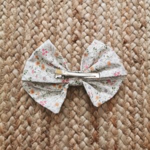 Lazo de niña en tela ,estampado de flores, con varios colores en tonos suaves como ,rosita ,mostaza clarito y verdes, el lazo mide 12,5 cm y es con gancho cocodrilo.