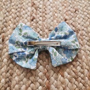 Lazo de niña en tela, con estampado de flores en varios tonos de azules y el fondo blanco, el lazo mide 12,5 cm y es con gancho cocodrilo.