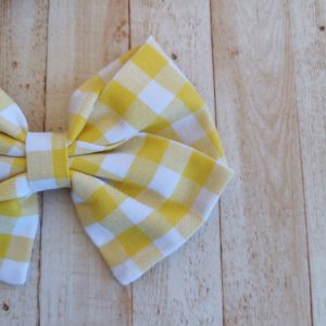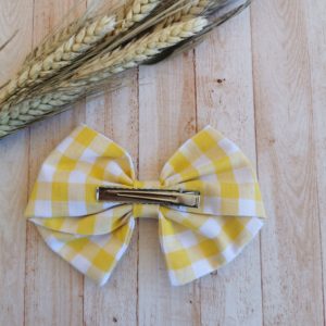 Lazo de niña en tela cuadro vichy amarillo, precioso, está muy de tendencia esta primavera-verano , el lazo mide 12,5 cm y es con gancho cocodrilo. También está la opción de diadema de lacito, búscala en complementos ,es una pasada de tela ,preciosa!!