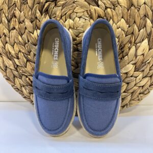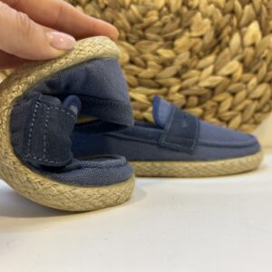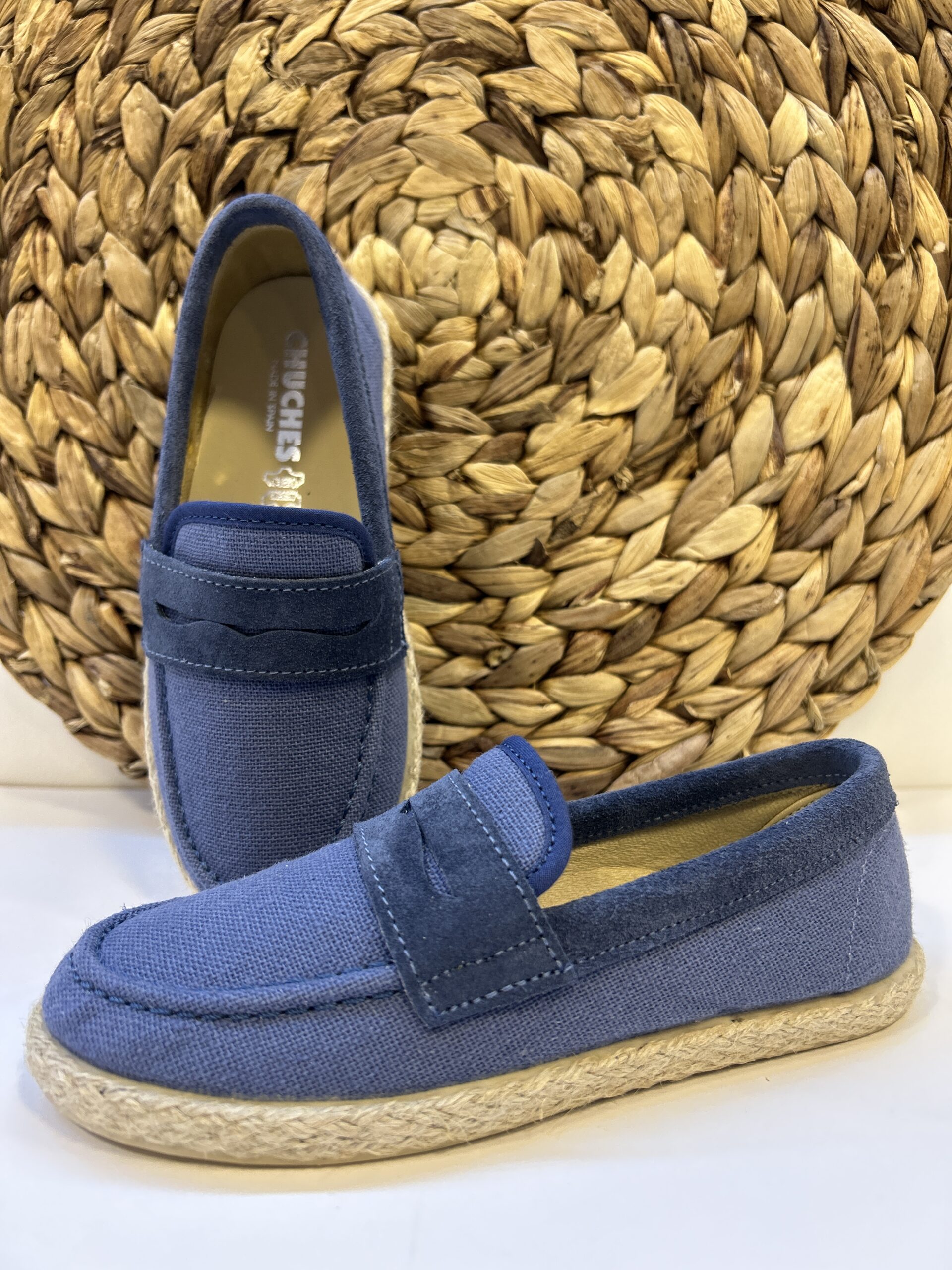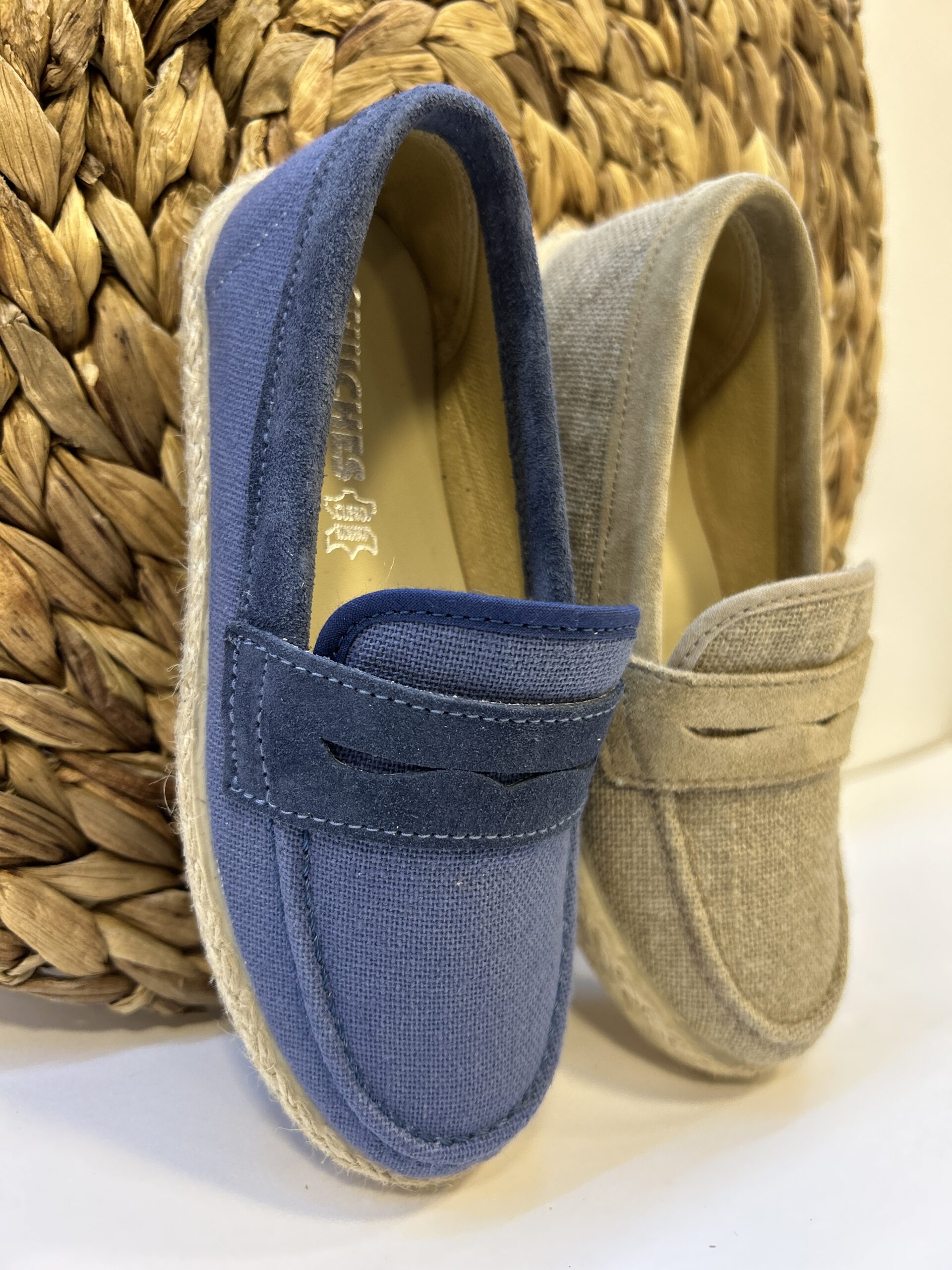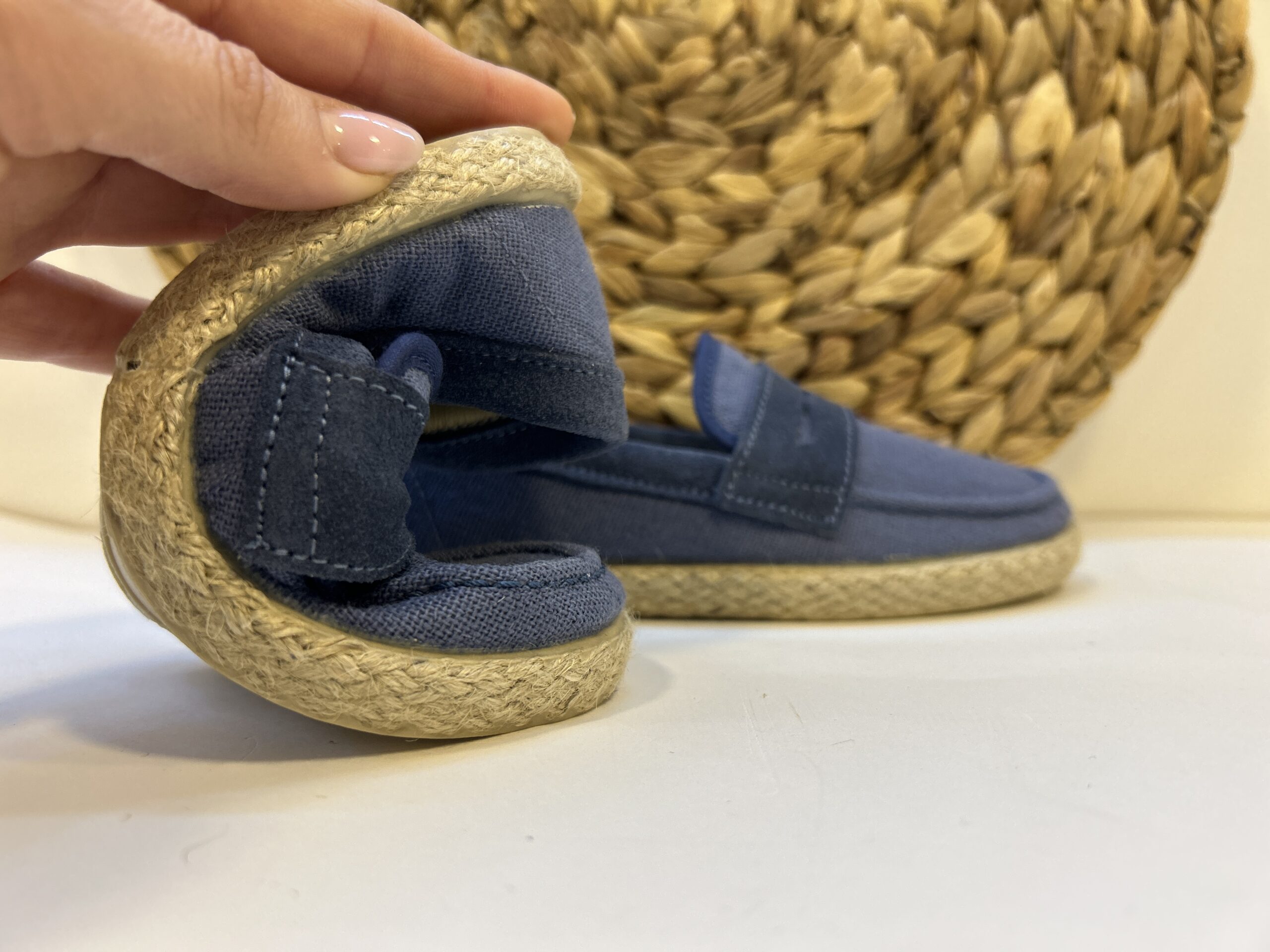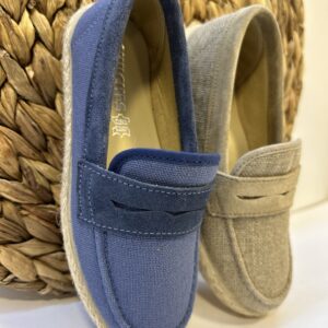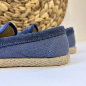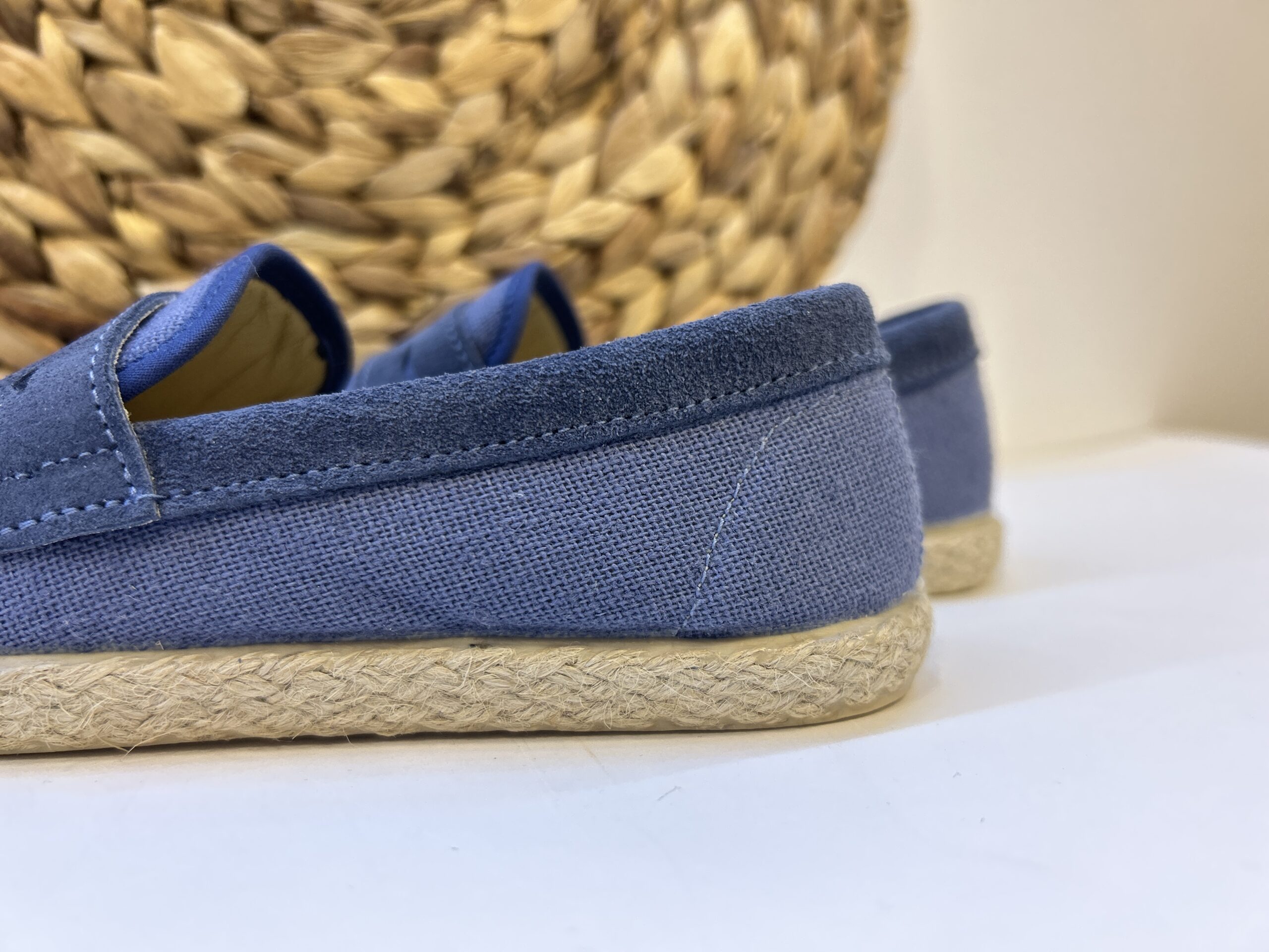 Nuevo Mocasín de lino tipo alpargata con diseño con antifaz en Piel Serraje y el interior en 100% piel , en color azul jeans , un color que te combinará con todo para esos eventos que tienes y también para poder arreglarlos en cualquier ocasión y quieras darle un toque mas elegante y dulce.