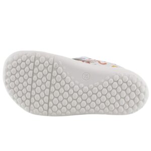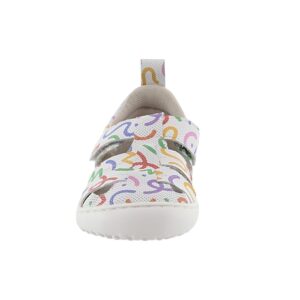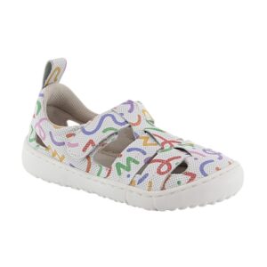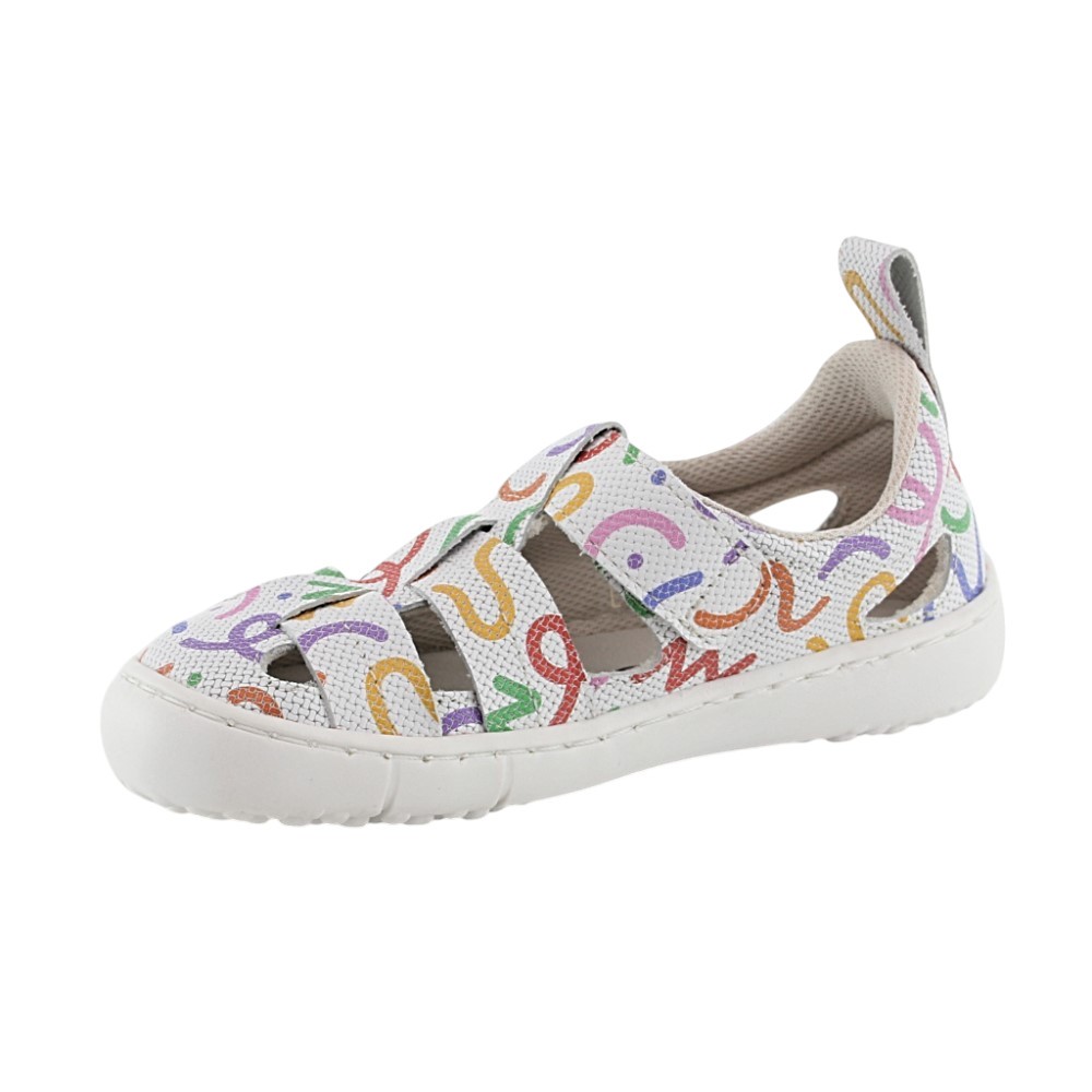 Sandalias cerradas respetuosos con el crecimiento y desarrollo natural de los pies. Este calzado es de la marca Coqueflex, modelo de color blanco con detalles multicolor. Tiene una suela de goma muy amplia, plana y flexible.