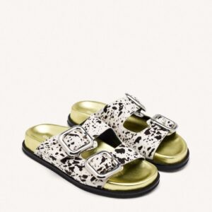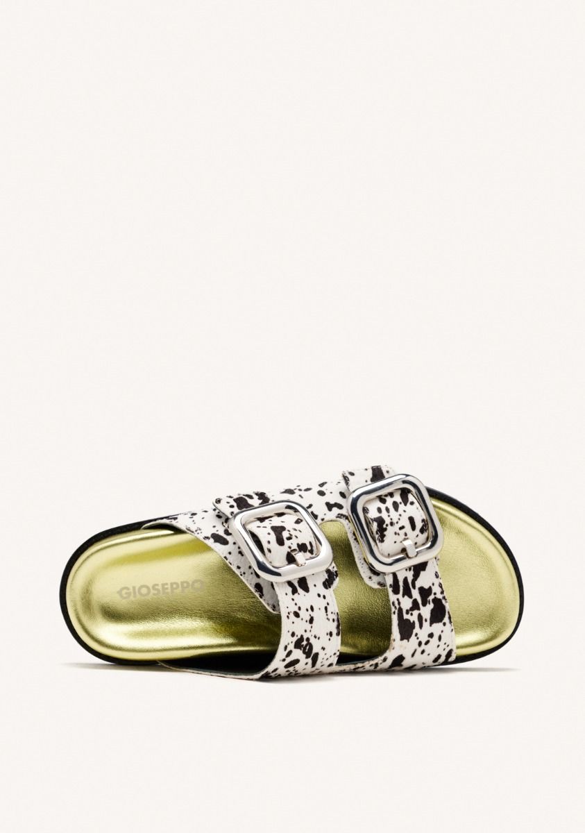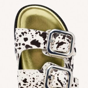 Sandalias de piel con hebillas y estampado animal. Cuentan con planta anatómica de microfibra forrada en piel metalizada, favoreciendo una posición correcta y evitando las sobrecargas musculares.