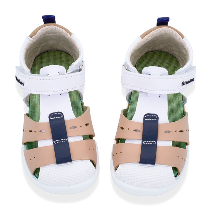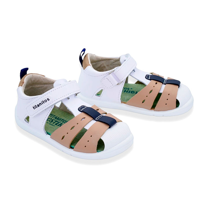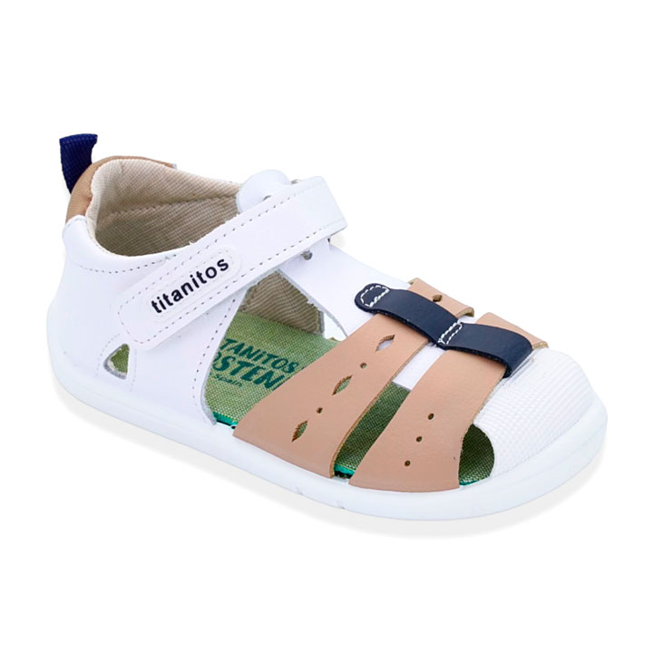 Sandalias Titanitos modelo EVO B500 en color blanco con motivos beig y azul. Son sandalias cerradas respetuosas que sirven para el día a día e incluso para alguna ocasión especial, gracias a los detalles en color que contrastan con el blanco del zapato. Está fabricada en piel y la suela es de goma antideslizante. Además, tiene refuerzos tanto delanteros como traseros para evitar los golpes y proteger los deditos.
