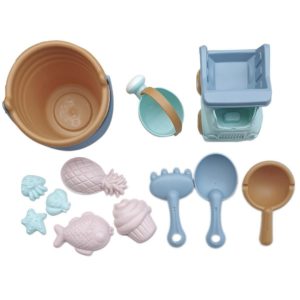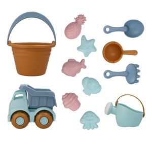 Completo set de juguetes de playa, con un camión, para hacer las construcciones más apasionantes a la orilla del mar.