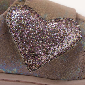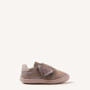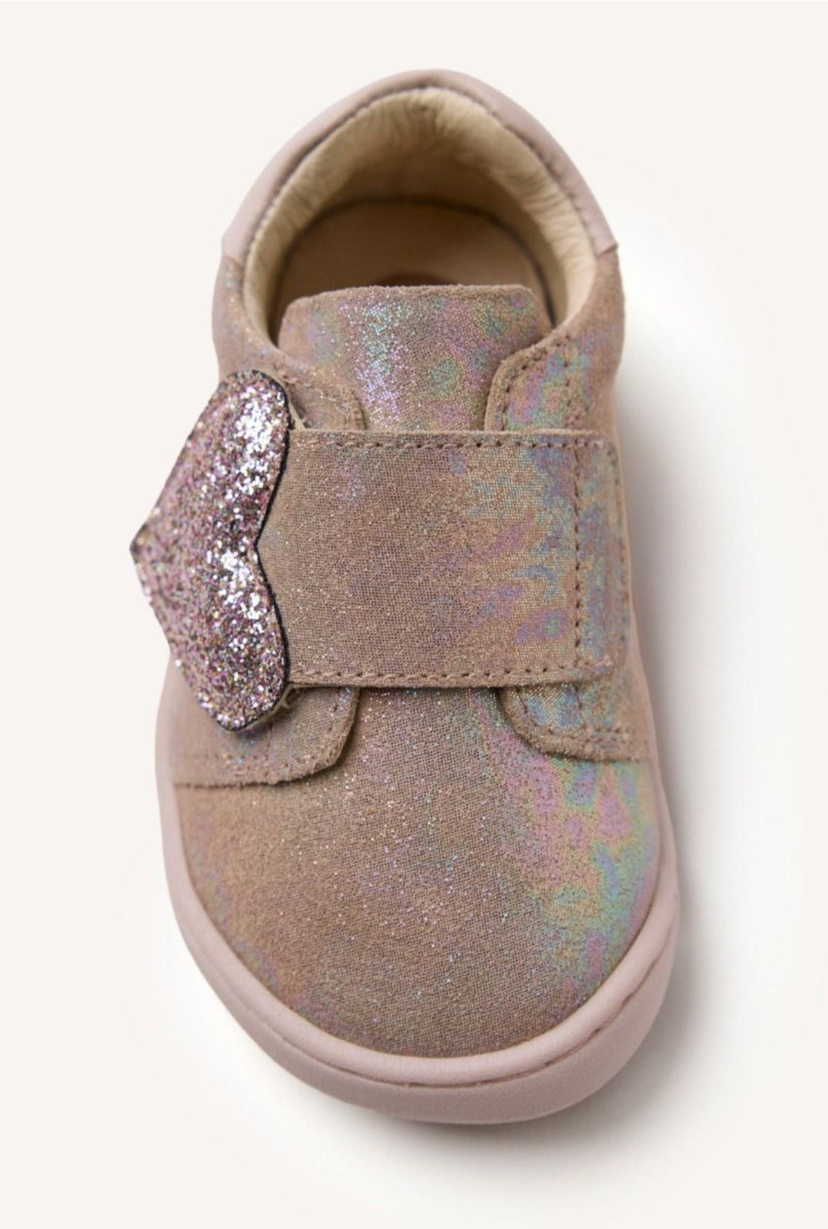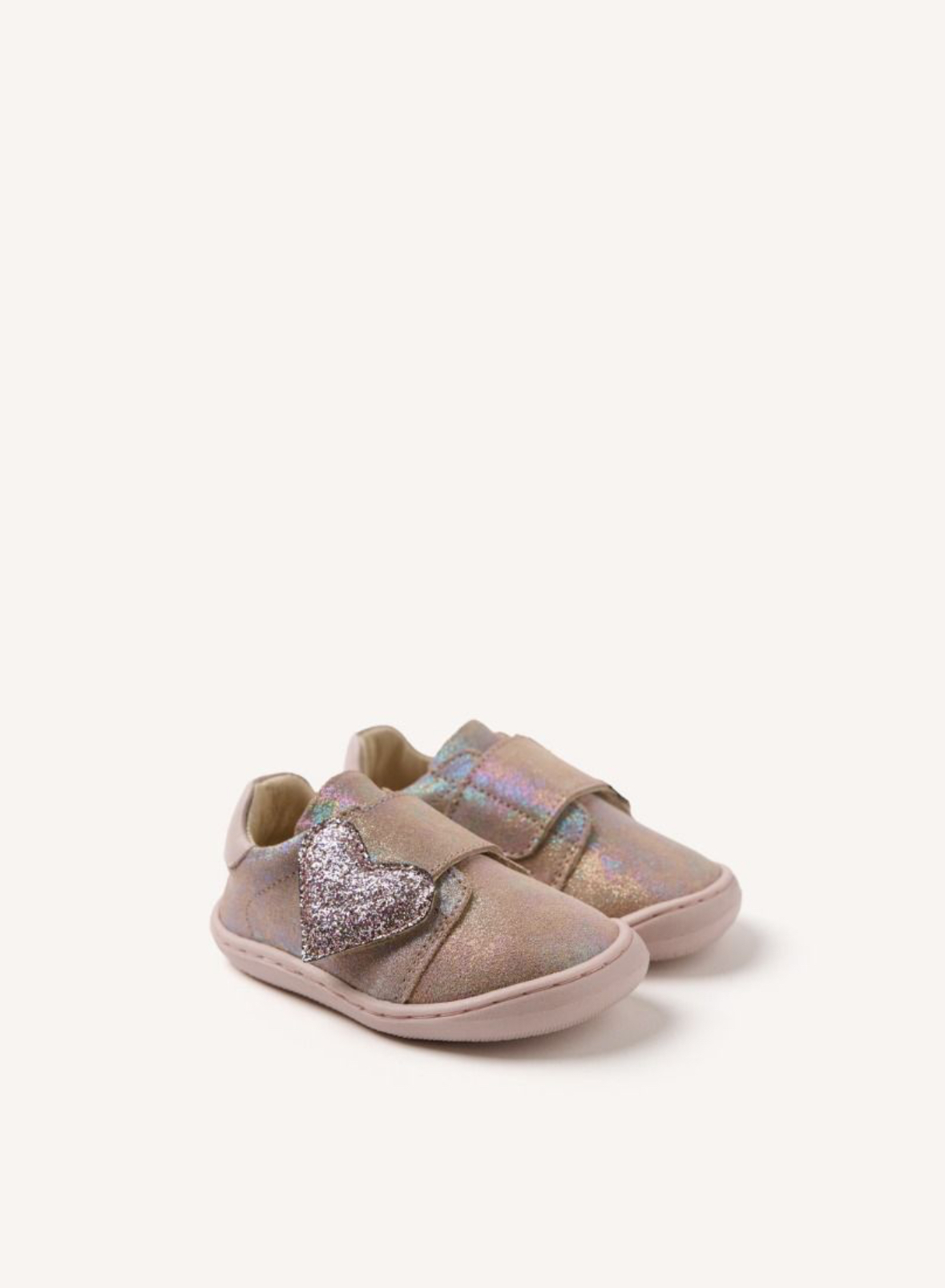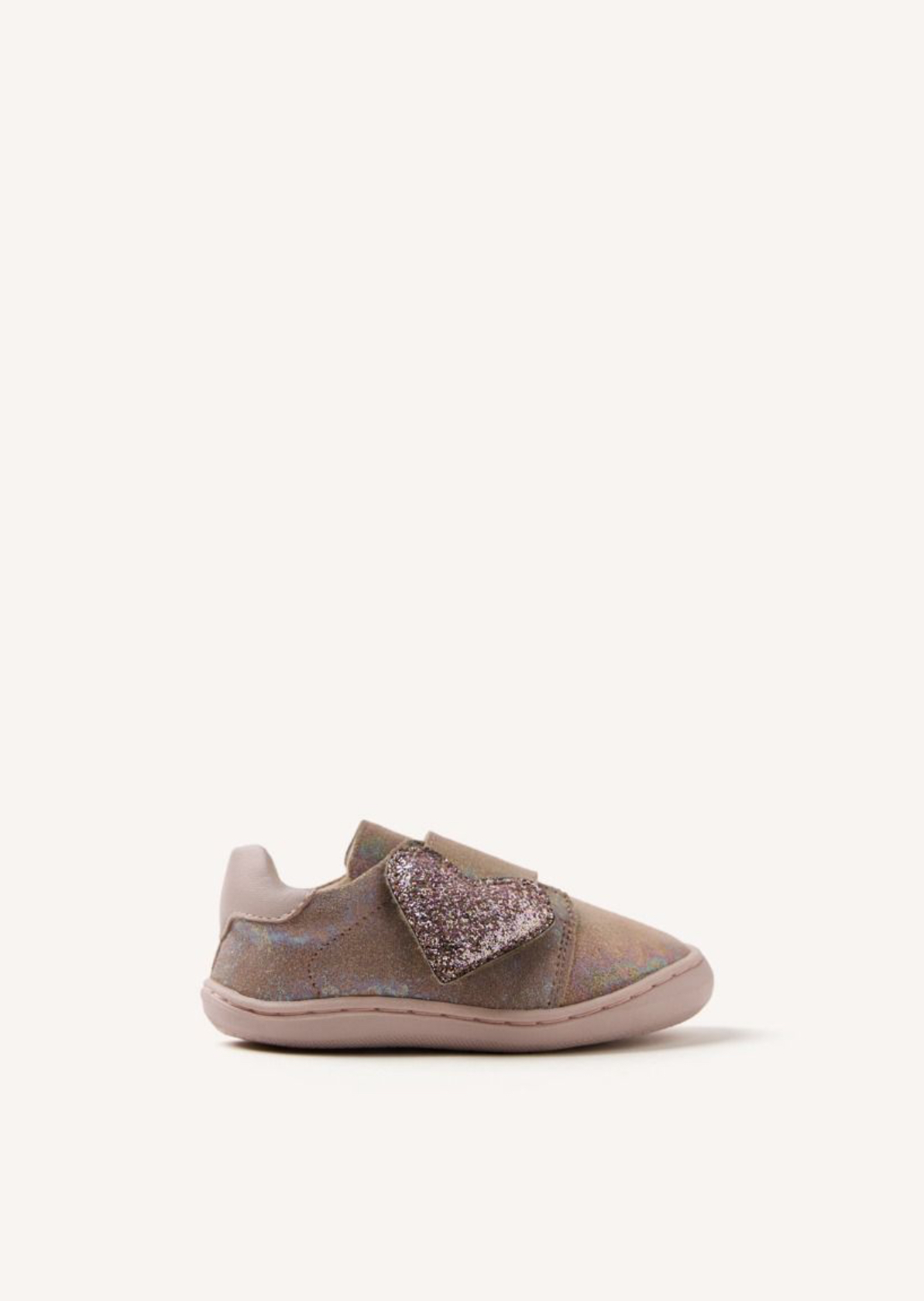 Zapatillas de piel serraje con acabado brillante. Cuentan con pieza en forma de corazón y cierres ajustables. Diseñadas siguiendo las tendencias minimalistas para garantizar la pisada natural.